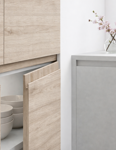 La porte de cuisine Anniversary Oak 01 en finition texturée synchronisée Syncron s'ouvre sans poignée visible grâce au profil J intégré. Sur mesure au millimètre, pensée pour une cuisine qui cherche le réalisme de la matière sans les contraintes du bois massif – remplace façades et tiroirs sans toucher aux caissons.