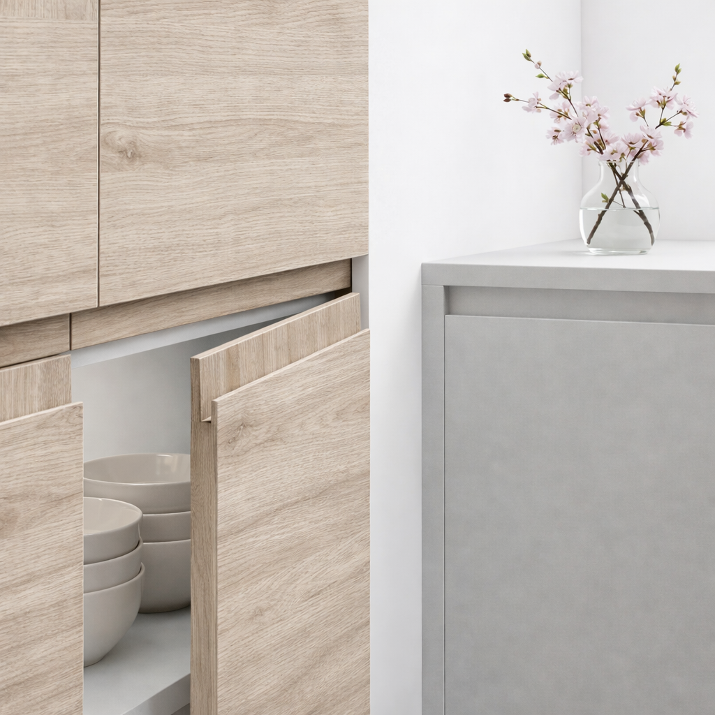 Épaisseur 22 mm, panneau de particules premium. La texture synchronisée masque naturellement les traces. Antibactérienne, anti-jaunissement. Façade taillée sur mesure selon votre configuration. Garantie fabricant 5 ans, fabrication CEE, expertise 50+ ans.