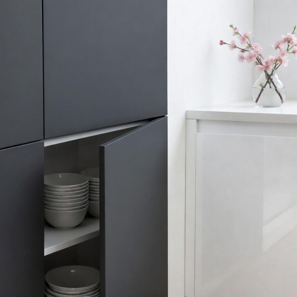 La porte de cuisine Antracita en finition supermate anti-traces Zénit est pensée pour une cuisine très exposée à la lumière ou une cuisine familiale à usage intensif. Sur mesure au millimètre, elle s'adapte à vos caissons existants – idéale pour une rénovation rapide sans refaire l'ensemble de la cuisine.