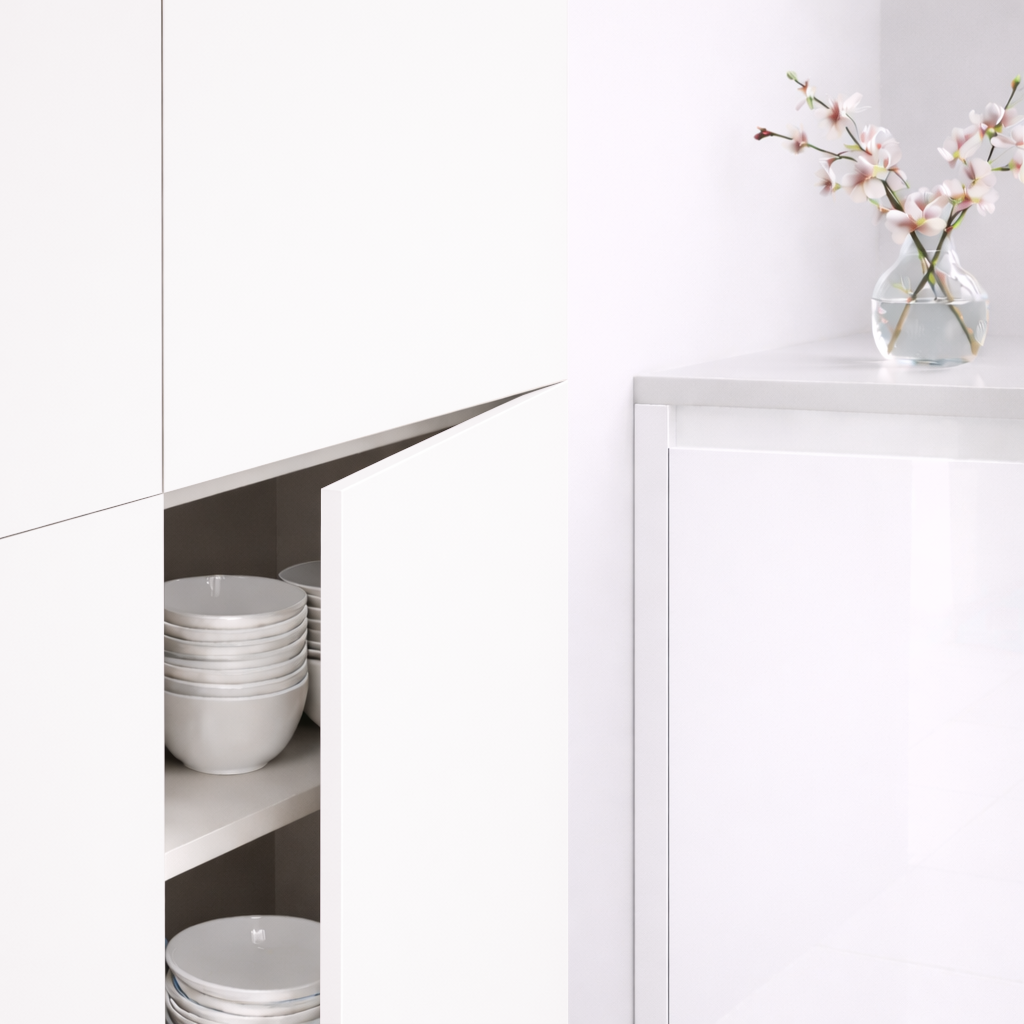 Porte de cuisine Blanc blanc – finition mate économique Mattdeco, modèle Standard 4 Chants. Ouverture : classique ou push. Variations de poignées intégrées disponibles : Formentera, Mallorca, Menorca, Ibiza, Tenerife, Madeira, Lanzarote. Format H 700 × L 600 mm (repère) – sur mesure au millimètre. Épaisseur 19 mm, aggloméré 70 % recyclé. Toucher soft velouté, anti-jaunissement. Note : finition non anti-traces de doigts. Le blanc épuré Syncron structure la cuisine dans une pureté minimaliste, à agrémenter de chêne ou d’inox.