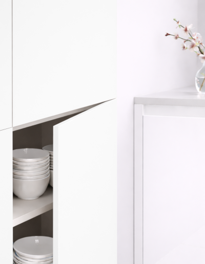Porte de cuisine Blanc Polaire blanc – finition supermate anti-traces Zénit, modèle Standard 4 Chants. Ouverture : classique ou push. Variations de poignées intégrées disponibles : Formentera, Mallorca, Menorca, Ibiza, Tenerife, Madeira, Lanzarote. Format H 700 × L 600 mm (repère) – sur mesure au millimètre. Épaisseur 19 mm, cœur MDF premium. Anti-traces (traces bien moins visibles au quotidien), antibactérienne, anti-jaunissement, résistance aux rayures, laque zéro COV. Le blanc épuré Syncron structure la cuisine dans une pureté minimaliste, à agrémenter de chêne ou d’inox.
