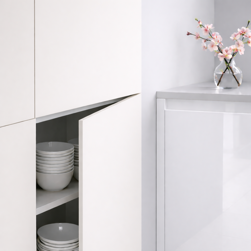 Épaisseur 19 mm, cœur MDF premium. Anti-traces (traces bien moins visibles au quotidien), antibactérienne, anti-jaunissement, résistance aux rayures, laque zéro COV. Poignée classique ou push. Façade sur mesure : chaque pièce est adaptée à votre configuration. Garantie fabricant 5 ans, fabrication CEE, expertise 50+ ans.