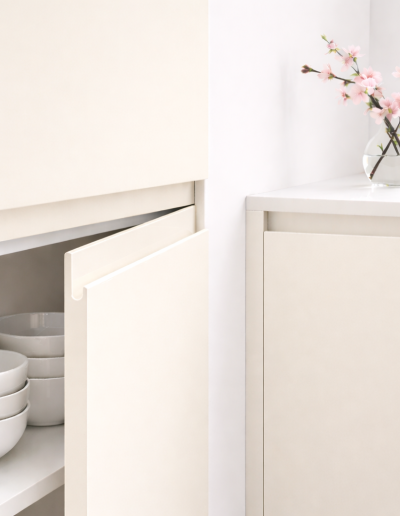 Porte de cuisine Cameo rose nude – finition supermate anti-traces Zénit, modèle Finger-Pull. Poignée intégrée profil J (Finger-Pull). Format H 700 × L 600 mm (repère) – sur mesure au millimètre. Épaisseur 22 mm, cœur MDF premium. Anti-traces (traces bien moins visibles au quotidien), antibactérienne, anti-jaunissement, résistance aux rayures, laque zéro COV. Le rose nude Cameo ultra mat crée une cuisine douce et tendance, à la féminité assumée et à l’entretien sans effort.