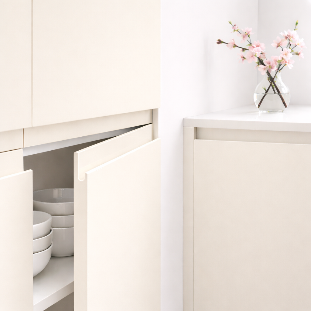La porte de cuisine Cameo en finition supermate anti-traces Zénit s'ouvre sans poignée visible grâce au profil J intégré. Sur mesure au millimètre, pensée pour une cuisine très exposée ou une cuisine familiale à usage intensif – remplace façades et tiroirs sans toucher aux caissons.