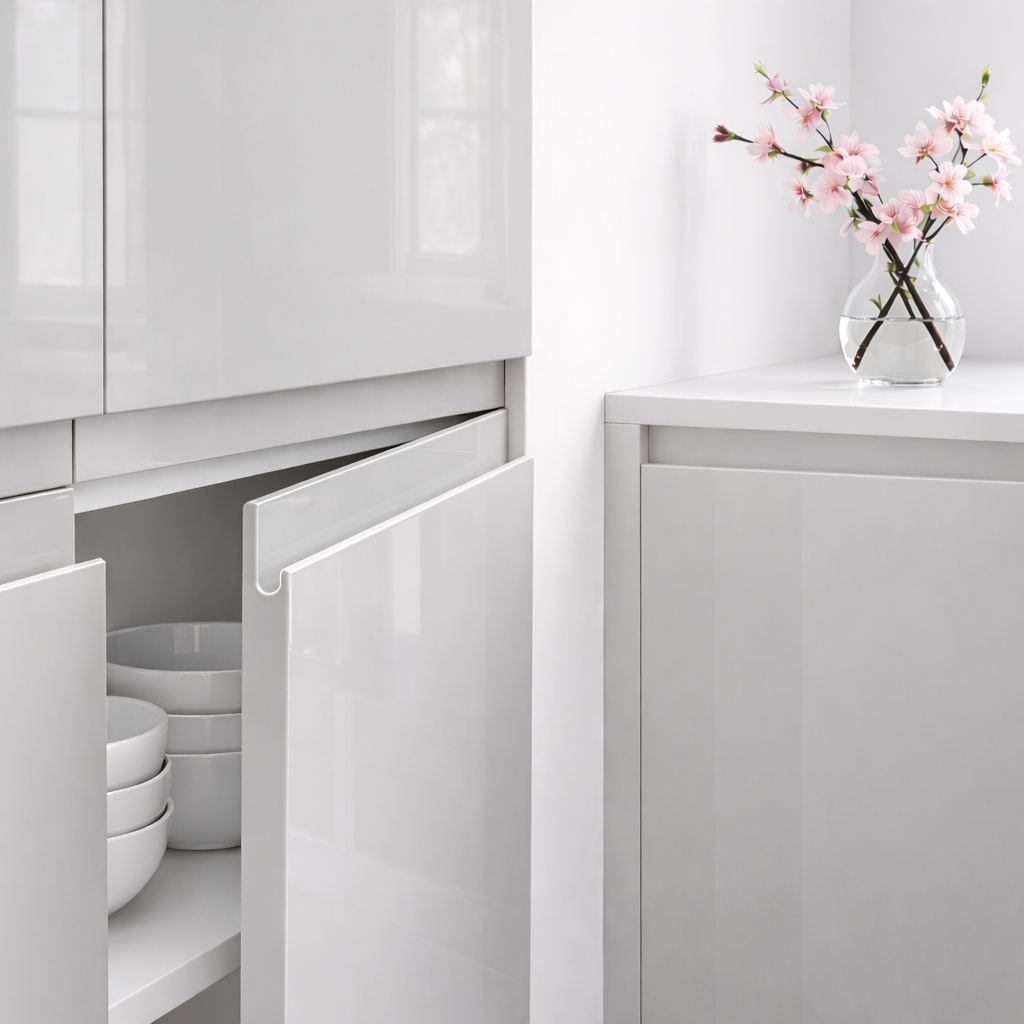 La porte de cuisine Cashmere Poignée Cashmere en finition haute brillance miroir Luxe s'ouvre sans poignée visible grâce au profil J intégré. Sur mesure au millimètre, pensée pour une cuisine ouverte ou un espace cuisine/salon qui cherche de l'impact visuel – remplace façades et tiroirs sans toucher aux caissons.