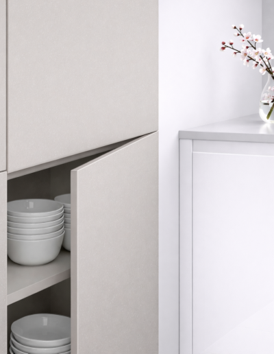 Les portes de cuisine Cashmere en finition supermate anti-traces Zénit sont pensées pour une cuisine très exposée à la lumière ou une cuisine familiale à usage intensif. Sur mesure au millimètre, elles s'adaptent à vos caissons existants – idéales pour une rénovation rapide sans refaire l'ensemble de la cuisine.