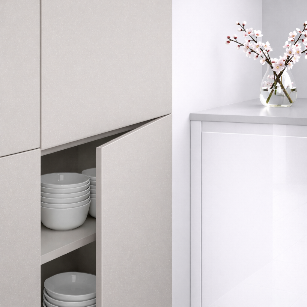 Épaisseur 19 mm, cœur MDF premium. Anti-traces (traces bien moins visibles au quotidien), antibactérienne, anti-jaunissement, résistance aux rayures, laque zéro COV. Poignée classique ou push. Façade sur mesure : chaque pièce est adaptée à votre configuration. Garantie fabricant 5 ans, fabrication CEE, expertise 50+ ans.