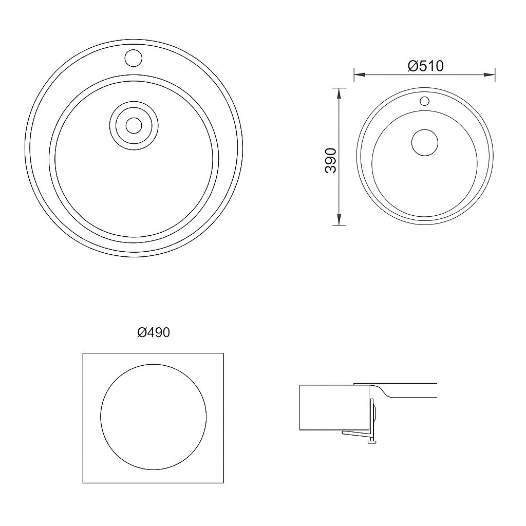 Son diamètre extérieur de 510 mm et sa cuve de 390 mm permettent un nettoyage confortable de la vaisselle tout en conservant un encombrement réduit. Grâce à sa profondeur de 170 mm, il est compatible avec de nombreux plans de travail. La bonde panier est incluse pour une évacuation rapide et un entretien facile. L’évier dispose également d’un pré-perçage central pour le montage d’un mitigeur.
