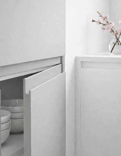 Épaisseur 19 mm, aggloméré 70 % recyclé. Finition mate sobre, anti-jaunissement. Note : finition non anti-traces de doigts. Poignée classique ou push. Façade sur mesure : chaque pièce est adaptée à votre configuration. Garantie fabricant 5 ans, fabrication CEE, expertise 50+ ans.