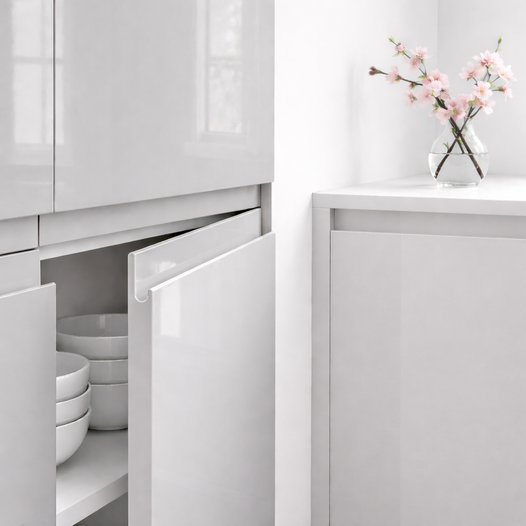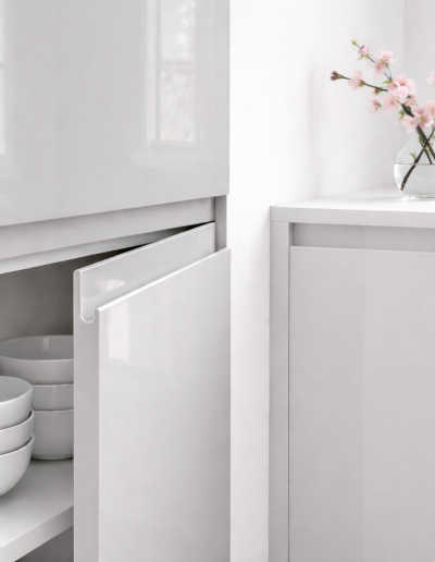Porte de cuisine Gris Nube Poignée Gris Nube – finition haute brillance miroir Luxe, modèle Finger-Pull. Poignée intégrée profil J (Finger-Pull). Format H 700 × L 600 mm (repère) – sur mesure au millimètre. Épaisseur 22 mm, cœur MDF premium. Résistante aux rayures et aux taches, antibactérienne, anti-jaunissement. Ce gris nuage brillant reflète la lumière pour amplifier l’espace cuisine, un neutre au fini miroir saisissant.