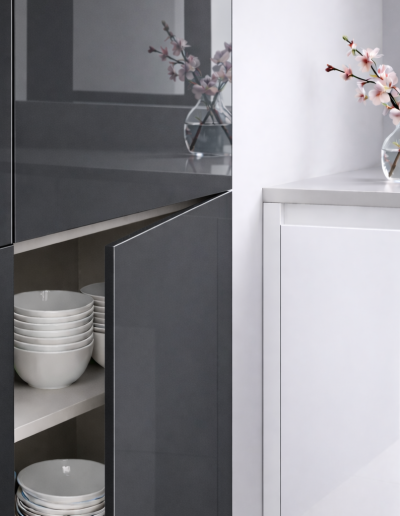 La porte de cuisine Gris Plomo en finition haute brillance Luxe est pensée pour une cuisine ouverte ou un espace cuisine/salon qui cherche de la lumière. Sur mesure au millimètre, elle s'adapte à vos caissons existants – idéale pour une rénovation rapide sans refaire l'ensemble de la cuisine.