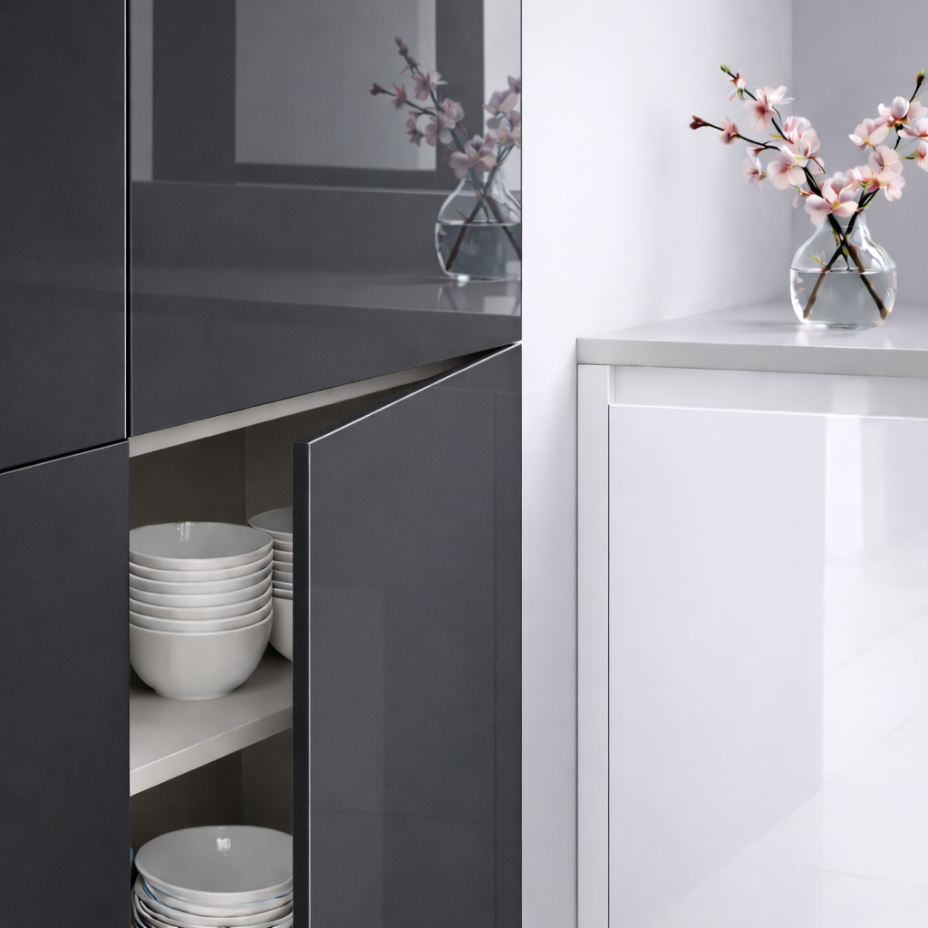 Épaisseur 19 mm, cœur MDF premium. Haute brillance miroir, antibactérienne, anti-jaunissement, résistance aux rayures et taches. Poignée classique ou push. Façade sur mesure : chaque pièce est adaptée à votre configuration. Garantie fabricant 5 ans, fabrication CEE, expertise 50+ ans.
