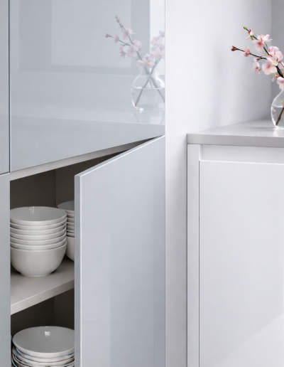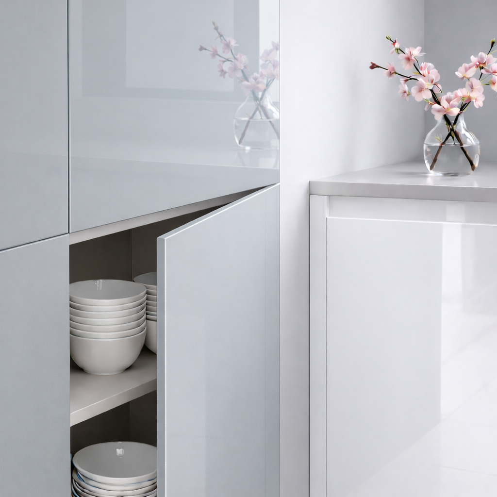 Épaisseur 19 mm, cœur MDF premium. Haute brillance miroir, antibactérienne, anti-jaunissement, résistance aux rayures et taches. Poignée classique ou push. Façade sur mesure : chaque pièce est adaptée à votre configuration. Garantie fabricant 5 ans, fabrication CEE, expertise 50+ ans.