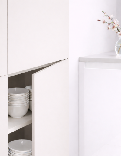 Épaisseur 19 mm, cœur MDF premium. Anti-traces (traces bien moins visibles au quotidien), antibactérienne, anti-jaunissement, résistance aux rayures, laque zéro COV. Poignée classique ou push. Façade sur mesure : chaque pièce est adaptée à votre configuration. Garantie fabricant 5 ans, fabrication CEE, expertise 50+ ans.