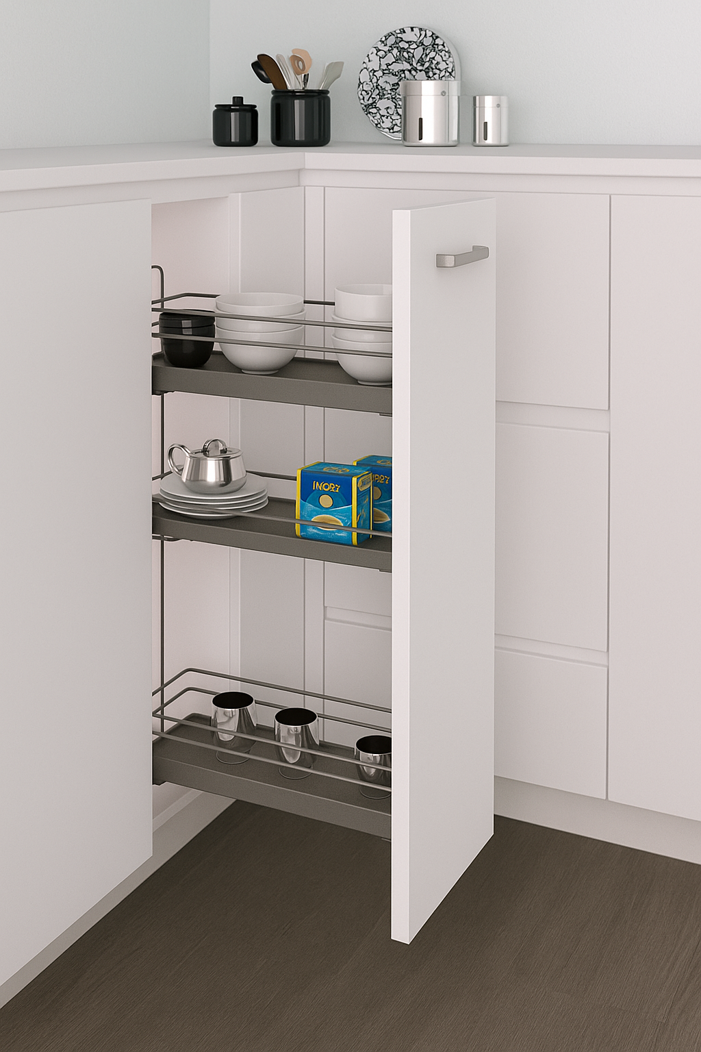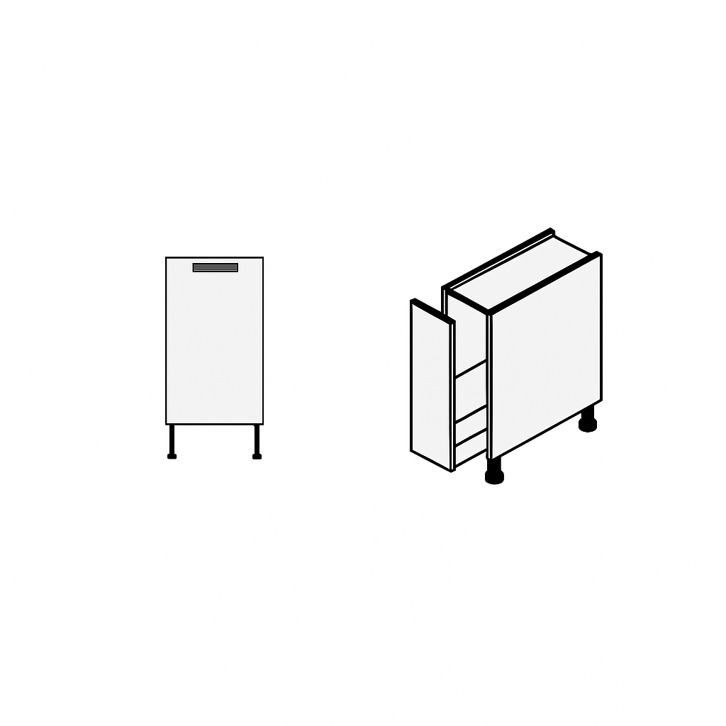 Ce modèle est particulièrement adapté aux configurations compactes ou comme élément de finition. Il peut accueillir un tiroir étroit pour créer un rangement personnalisé, ou être intégré dans une colonne fonctionnelle en complément d’autres meubles de même profondeur.