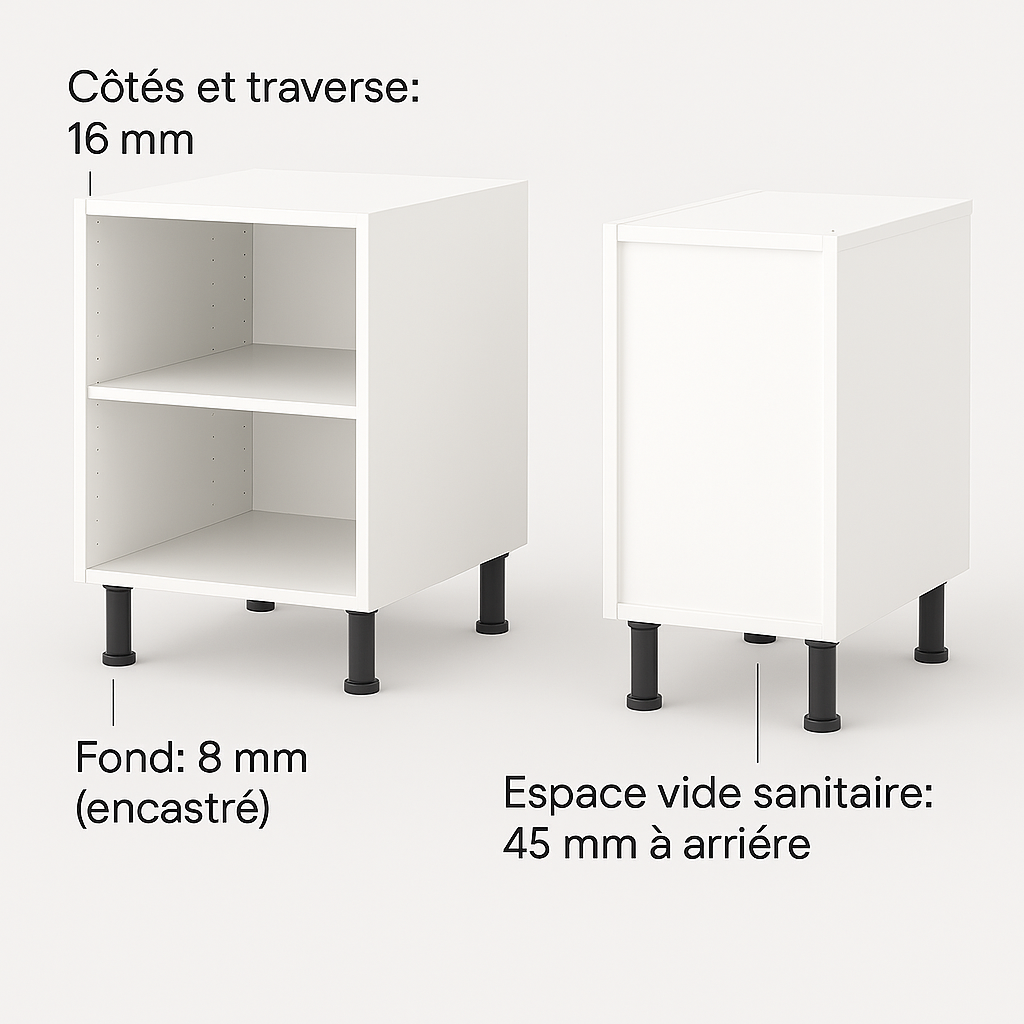 Les hauteurs indiquées correspondent à la structure du caisson hors pieds. Les pieds réglables inclus permettent d’ajuster la hauteur finale pour une parfaite alignement sous le plan de travail.