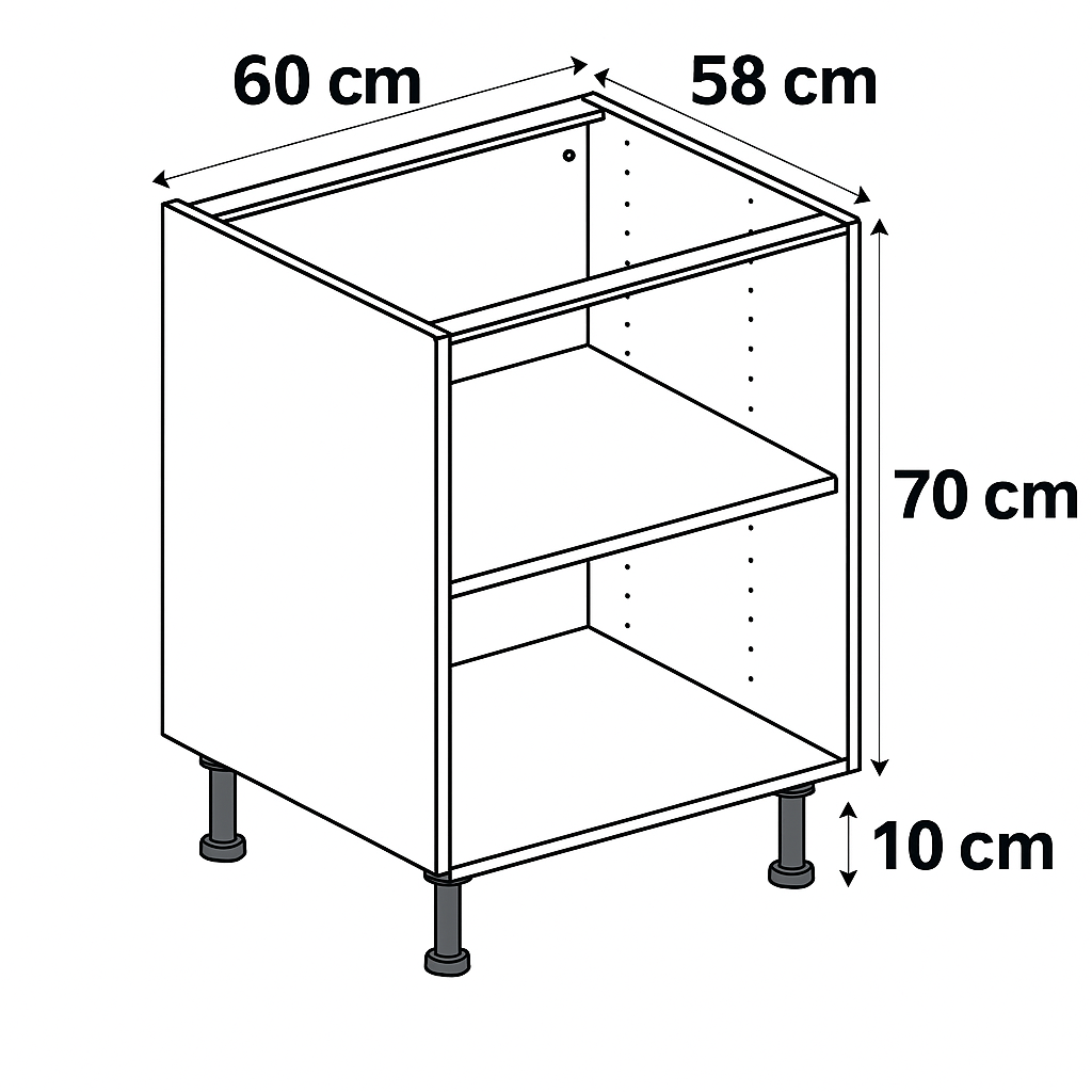 Fonctionnel, stable et pensé pour durer, ce meuble bas caisson 700 × 600 × 580 mm est idéal pour organiser l’espace sous votre plan de travail. Grâce à sa largeur de 60 cm et sa profondeur de 58 cm, il peut accueillir un four encastrable, un micro-ondes ou servir de meuble de rangement pour la vaisselle et les ustensiles.