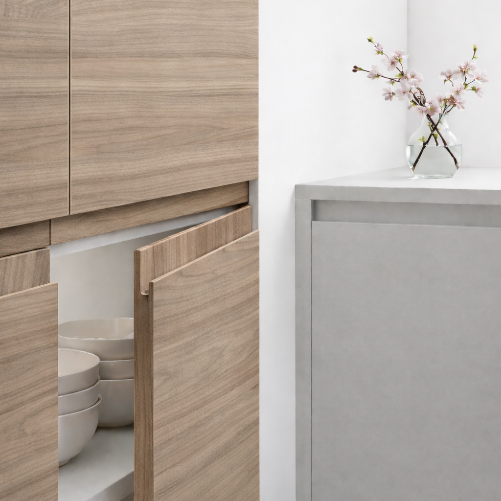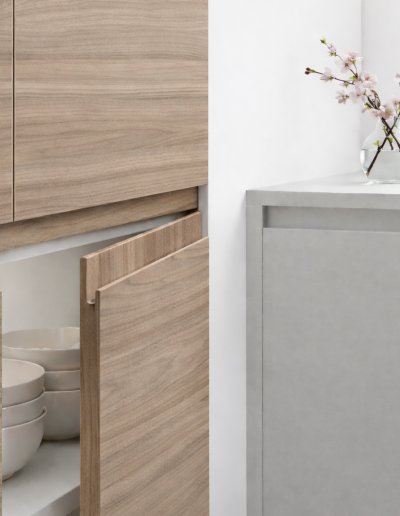 La porte de cuisine Nocce 01 en finition texturée synchronisée Syncron s'ouvre sans poignée visible grâce au profil J intégré. Sur mesure au millimètre, pensée pour une cuisine qui cherche le réalisme de la matière sans les contraintes du bois massif – remplace façades et tiroirs sans toucher aux caissons.