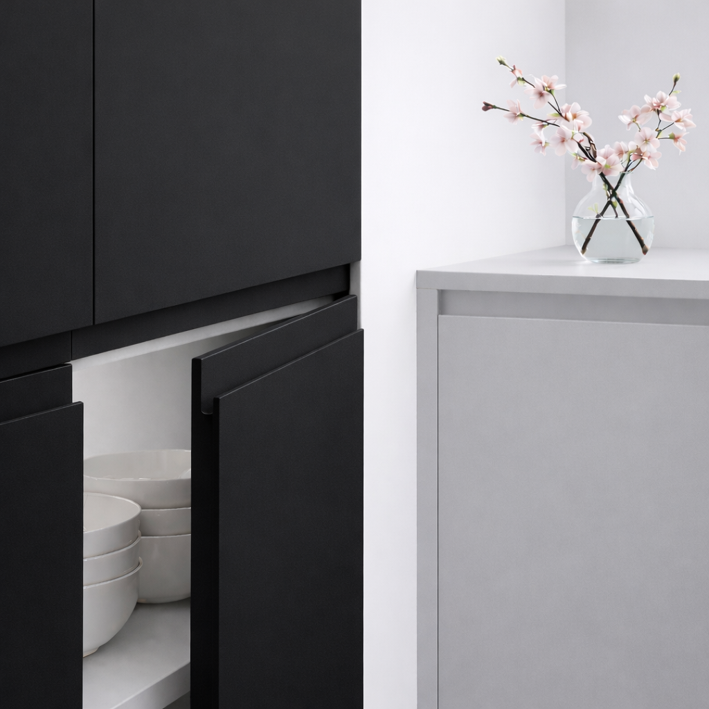 La porte de cuisine Noir Poignée Noire en finition supermate anti-traces Zénit s'ouvre sans poignée visible grâce au profil J intégré. Sur mesure au millimètre, pensée pour une cuisine très exposée ou une cuisine familiale à usage intensif – remplace façades et tiroirs sans toucher aux caissons.