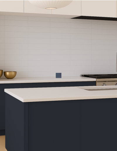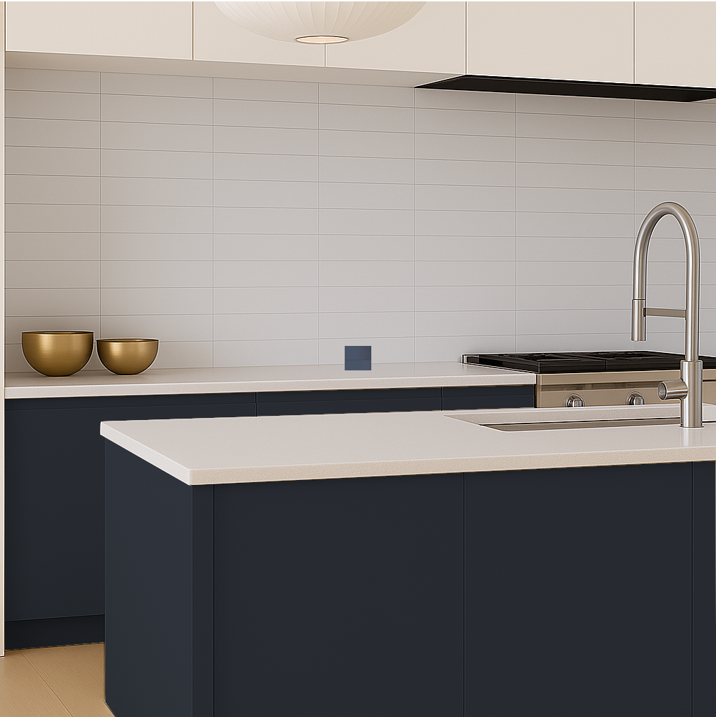 Le Bleu Abîme s'intègre parfaitement dans des cuisines aux configurations variées. Cette teinte profonde et mate s’associe à des couleurs unies comme le blanc ou le beige pour un effet lumineux et apaisant. Pour un style plus audacieux, combinez-le avec des gris clairs ou des touches de vert afin de renforcer son caractère unique tout en équilibrant la palette globale.