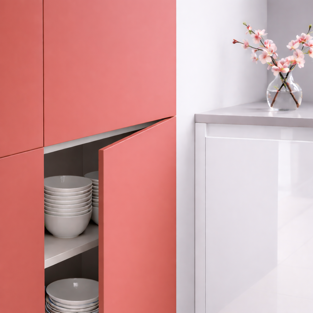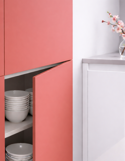 Porte de cuisine Rojo Pompei rouge pompéien – finition supermate anti-traces Zénit, modèle Standard 4 Chants. Ouverture : classique ou push. Variations de poignées intégrées disponibles : Formentera, Mallorca, Menorca, Ibiza, Tenerife, Madeira, Lanzarote. Format H 700 × L 600 mm (repère) – sur mesure au millimètre. Épaisseur 19 mm, cœur MDF premium. Anti-traces (traces bien moins visibles au quotidien), antibactérienne, anti-jaunissement, résistance aux rayures, laque zéro COV. Le rouge pompéien Rojo Pompei impose à la cuisine un caractère audacieux et méditerranéen, entre art et élégance colorée.