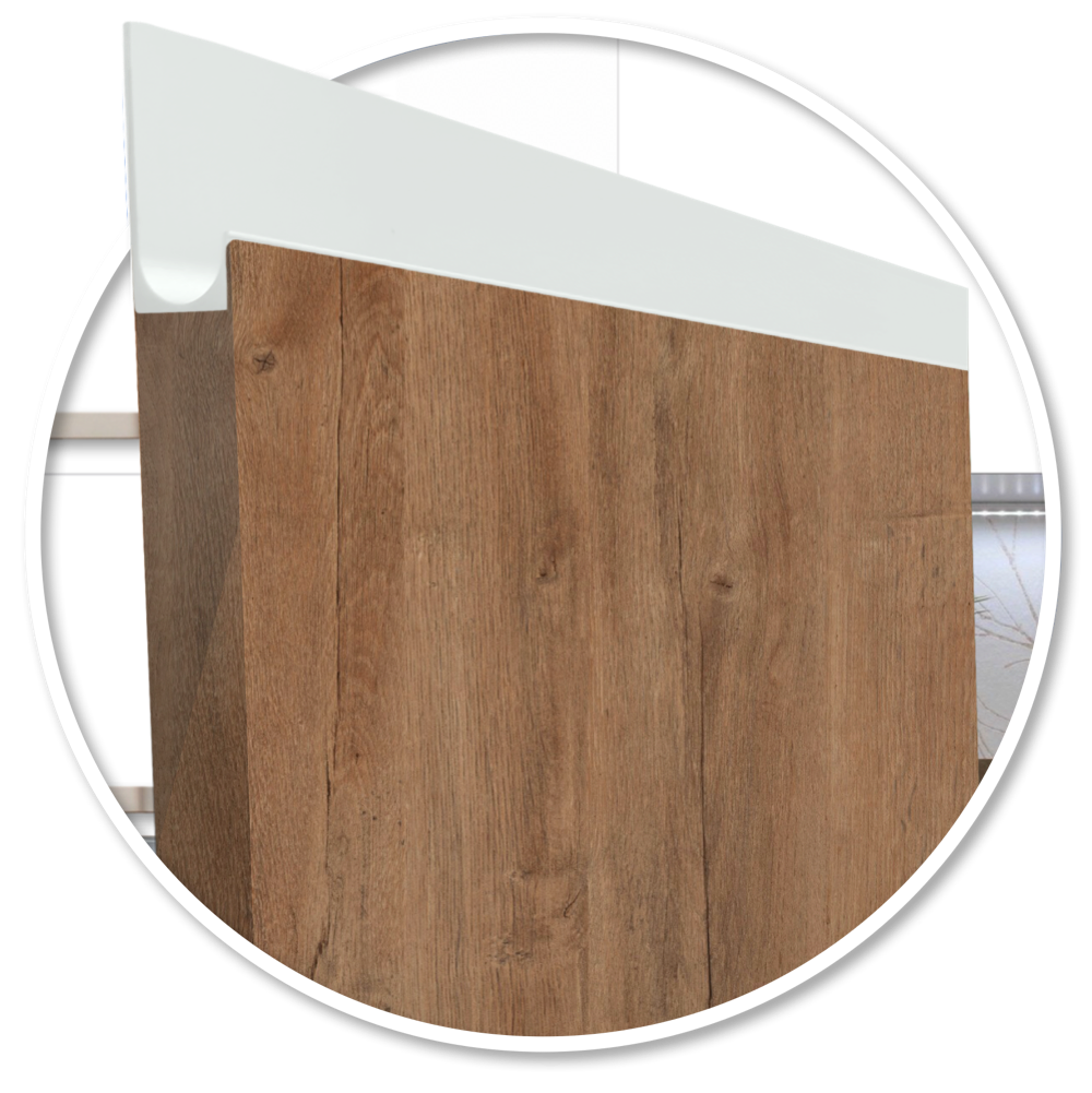 Wood-Chêne Nervia se distingue par son veinage discret et sa finition mate, pensée pour durer et facile à vivre au quotidien. Son cœur en mélaminé garantit une excellente résistance à l’humidité et aux sollicitations fréquentes. La poignée blanche intégrée, à la fois douce au toucher et visuellement légère, parachève un ensemble élégant et fonctionnel.