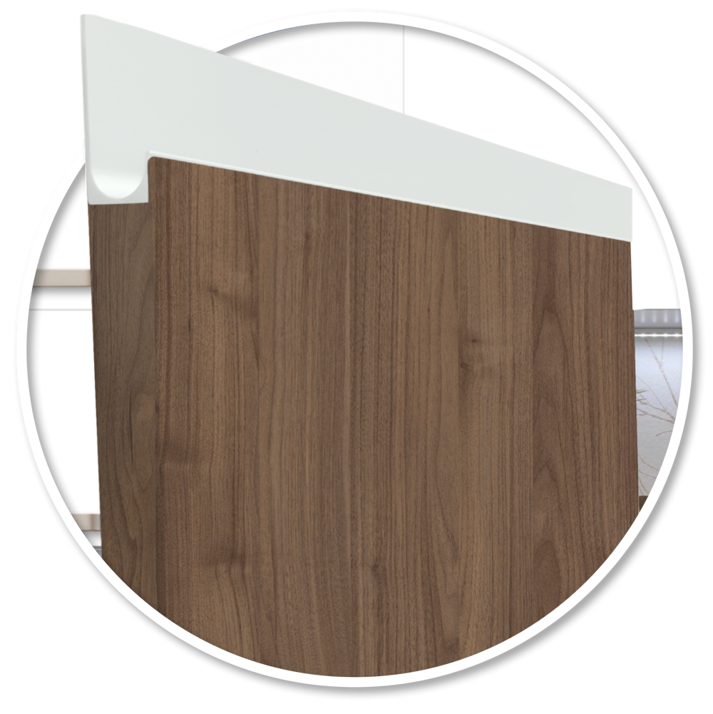 "Wood-Oak Toscane séduit par sa teinte bois profond et sa texture nervurée élégante. Sa poignée blanche intégrée lui donne un style affirmé et fluide, parfait pour changer portes de cuisine avec distinction."